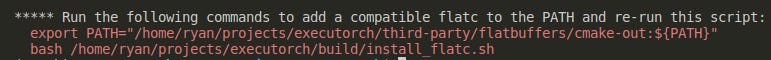 I’m not going to go through the installation instructions in detail because it’s fairly short and standard. After installing the requirements, make sure not to miss the printed statement here about flatc. PyTorch uses flatc in the XNNPACK export later on and they presumably use it in other situations as well. Running these two commands will ensure flatc is properly installed and ready to use.