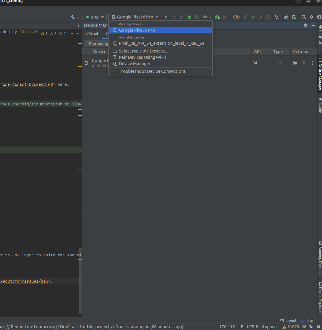 executorch/examples/demo-apps/android/ExecuTorchDemoThis will open the project in Android Studio. Now, you can use the built-in Pixel 3a emulator or, if you have an Android phone, you can add that. To connect your device to Android Studio, you’ll need developer options on your phone. If you haven’t enabled developer options, go to “Settings→About phone” and tap “Build number” a bunch until a popup tells you that you’ve enabled developer options (I am on Android 14 and can’t remember if it’s the same process for other versions). Then, go back into Settings and go to “System→Developer options”. In the developer options, there’s a debugging section with “Wireless debugging” option. This has a toggle next to it but you can actually click into it. This will give you the ability to “Pair device with QR code” which is how I’m connected to my computer which will require you to be on the same network as your computer.