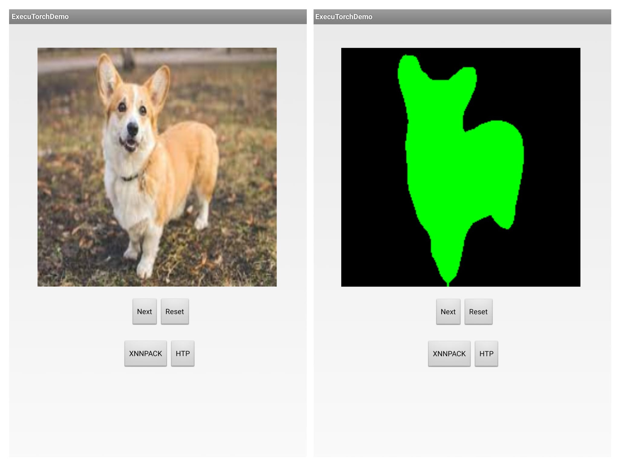 python3 -m examples.xnnpack.aot_compiler --model_name="dl3" --quantize --delegateThis is a fast operation and ran in 1.5 minutes on my machine. Then you just have to drop it in the folder, change the values in “MainActivity” where the model is defined (I believe the lines should be 103 and 138), and re-run the app.